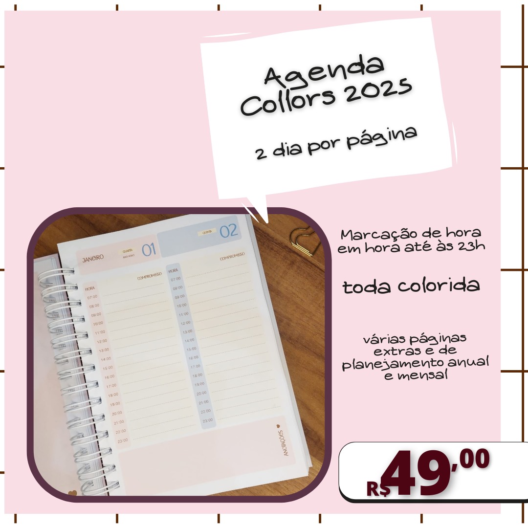 Agenda Collors 2 dias por página com horários de 30 em 30 min