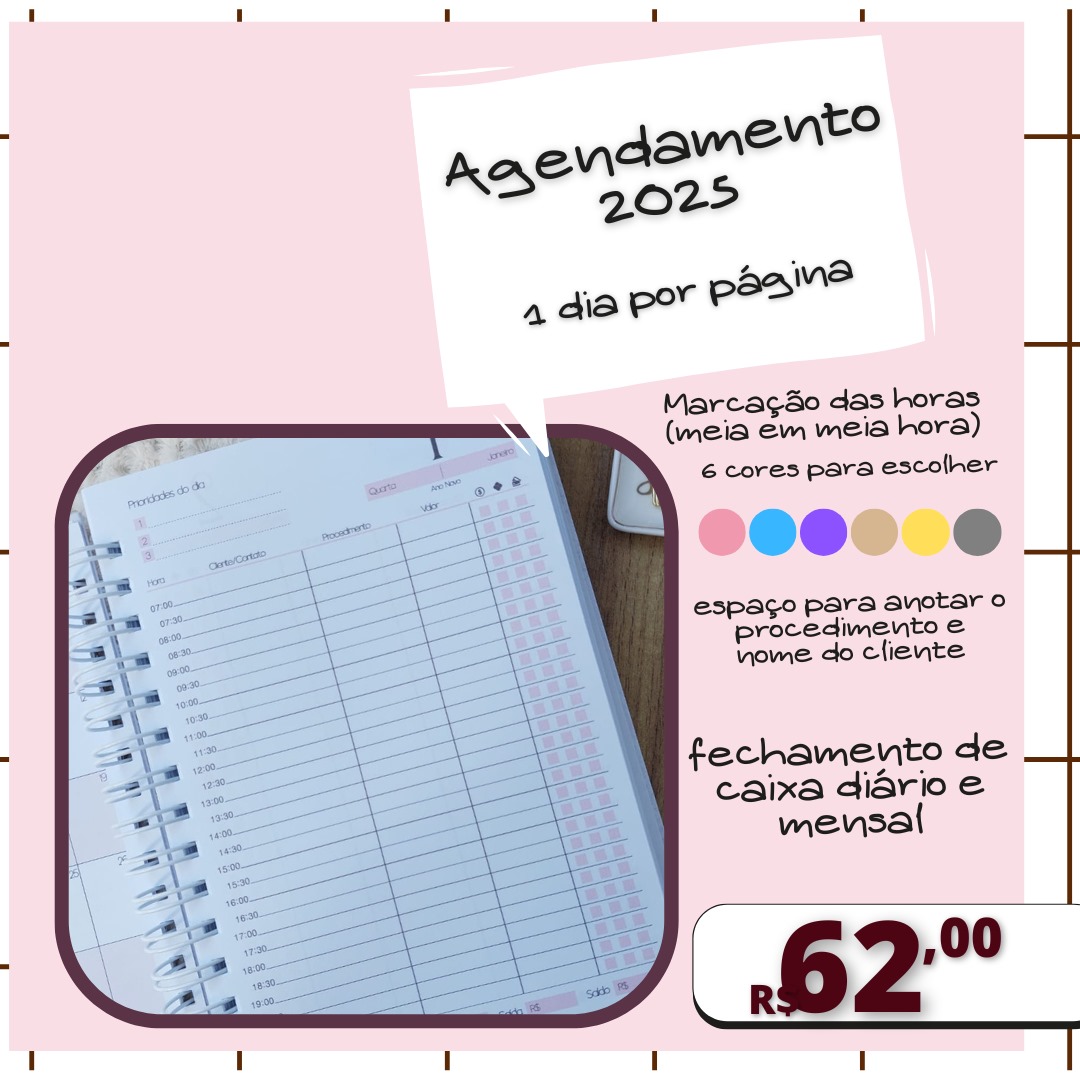 *1 dia por página, inclusive sábado e domingo e marcação de horários (de 30 em 30 minutos das 7h00 às 19h30),